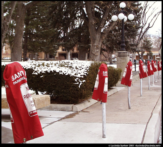 SecuritySanta Fe style security—official “No Parking” hoods over all of the parking spaces in front of the United States Courthouse. |