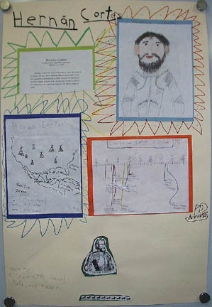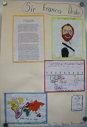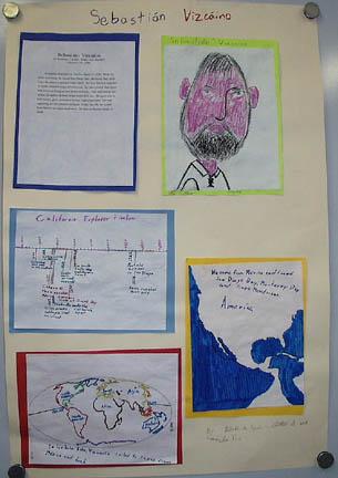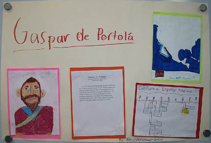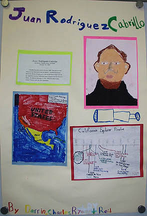 Each group chose an explorer who was important in the history of California. Students made timelines of California and placed their explorers in time, made maps to show where the explorers traveled, drew portraits of what the explorers might have looked like, and wrote essays about the goals and accomplishments of the explorers. Then each group created a poster and made a presentation to the rest of the class. Explorers we learned about: