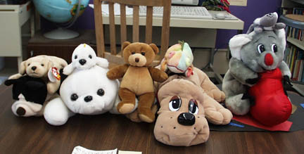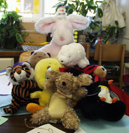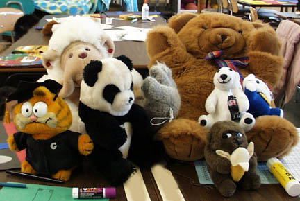 It's Stuffed Animal Day in Room 9 at Barron Park School. It looks like the 17 bears were really popular. The 12 dogs came in second. It's amazing what exotic animals people brought: hedgehogs, kangaroos, and even people! It was interesting to watch the kids make animal graphs. We asked Kiyoshi how he liked Stuffed Animal Day and he said, "It was great!" --by Devin