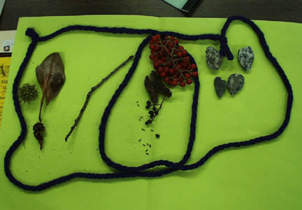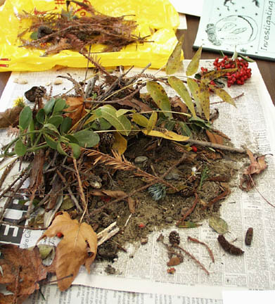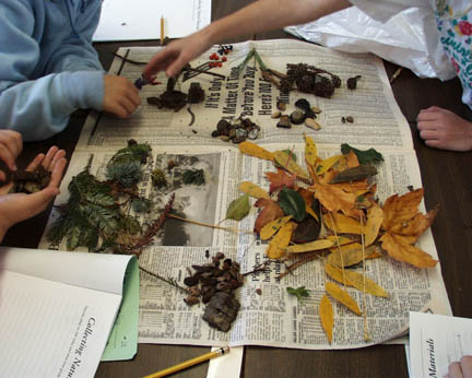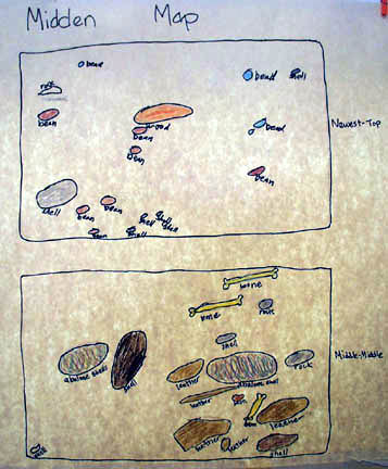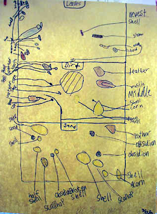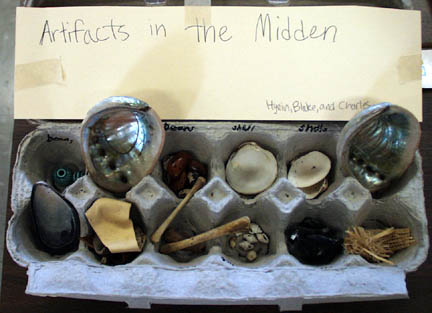 In the first section of this unit we walked to Bol Park to collect natural materials which we sorted and classified and then used for a math lesson on Venn Diagrams. Then we made masks. In the second section we listened to myths, wrote our own myths, created posters to illustrate the myths, and shared our myths around a "campfire" in the Library. In the final section of the unit we excavated "middens" by carefully sieving the soil and cleaning the artifacts, recording the spot where each artifact was discovered. The completed midden maps (another map) and museums (another museum) will help us draw inferences about the culture from the artifacts we found.