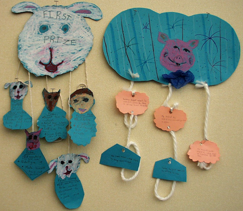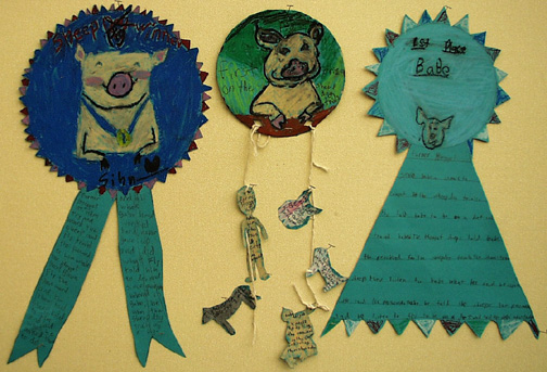 Babe, the Gallant Pig, by Dick King-Smith, was fun to read even though the dialect was often difficult to understand. We learned many new vocabulary words about sheep herding and discovered how being brave and polite can lead to success. The final activity for this book was to create ribbons (three examples & three more & a final two examples) summarizing how each character helped Babe achieve his goal.