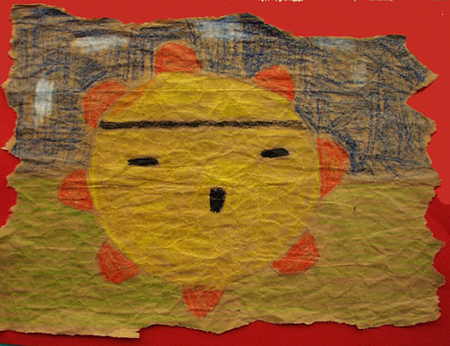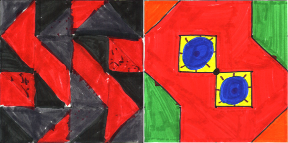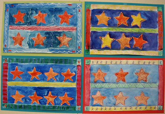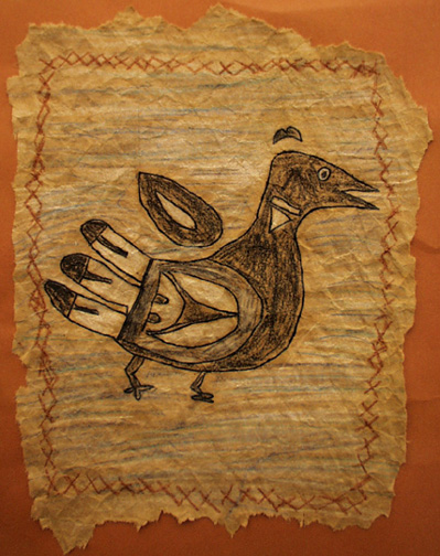 Native American Symbols: After studying Native Americans we created works featuring symbols like the thunderbird, the rattlesnake, the bird, the sun, the kachina, the cloud people, and another sun.