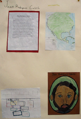 California Explorers: Each group chose an explorer who was important in the history of California. Students made timelines of California and placed their explorers in time, made maps to show where the explorers traveled, drew portraits of what the explorers might have looked like, and wrote essays about the goals and accomplishments of the explorers. Then each group created a poster and made a presentation to the rest of the class. Explorers we learned about: Álvar Nuñez Cabeza de Vaca, Juan Rodríguez Cabrillo, Hernán Cortés, Sir Francis Drake, Sebastián Vizcaíno.