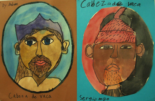 Explorer Portraits: We learned to make portraits while studying explorers. Here are portraits of Álvar Nuñez Cabeza de Vaca, Juan Rodríguez Cabrillo, Hernán Cortés, Sir Frances Drake, and Sebastián Vizcaíno.