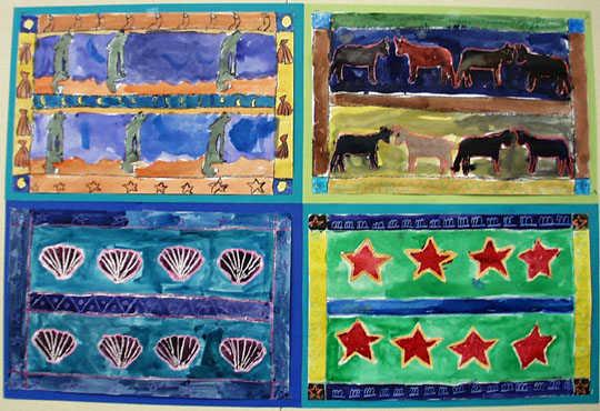 Island of the Blue Dolphins: After reading Island of the Blue Dolphins, by Scott ODell, we created crayon and watercolor pieces depicting symbols from the book. Here are four examples and four more.