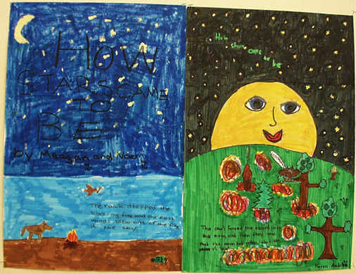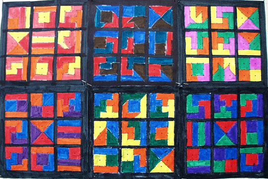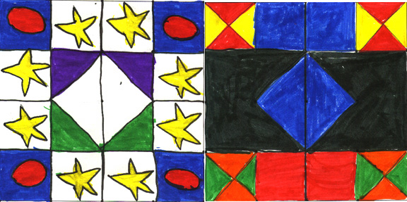 Quilts: Each student made a Crazy Quilt with a different design in each quilt piece. The finished individual quilts are displayed together in a class quilt which symbolizes all of the different personalities that are joined together into one whole classroom community. Here are four example quilts, and four more.