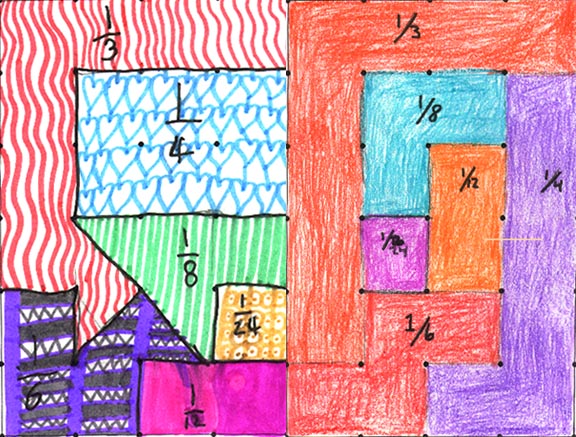 Equal Shares, Different Pieces: We explored fractions in this unit. While looking at fractions as equal area divisions, we made Quilts of Fourths (more examples). We also used the area model to divide Squares and Rectangles into fractional parts.