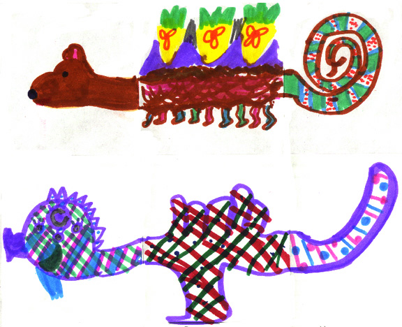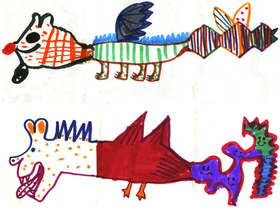 ArtCreatures: Three students worked together to make different sections of imaginary creatures. Here are two examples and two more.