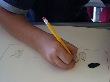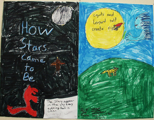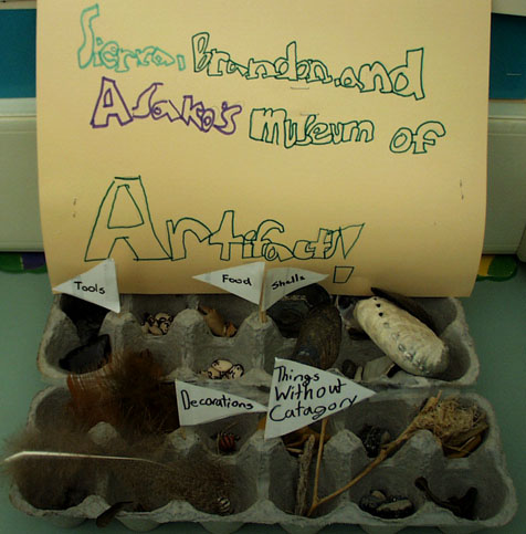 Investigating Artifacts: In the first section of this unit we walked to Bol Park to collect natural materials which we sorted and classified. We used our natural materials for a math lesson on Venn Diagrams. It was fun trying to figure out the Secret Sorting Rule of each Venn Diagram: Venn Diagram #1, Venn Diagram #2, Venn Diagram #3. Most were very hard to guess! Then we made masks (more masks). In the second section we listened to myths, wrote our own myths, created posters (more posters) to illustrate the myths, and shared our myths around a “campfire” in our classroom. In the final section of the unit we excavated “middens” by carefully sieving the soil, cleaning and polishing the artifacts, and recording the spot where each artifact was discovered with a sketch. The completed midden maps and museums helped us draw inferences about the culture from the artifacts we found.