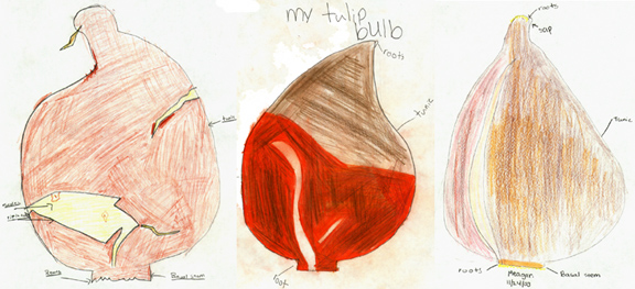 Each student measured the circumference of a tulip bulb, weighed it, and then predicted when that bulb would emerge and bloom in relation to the rest of the class bulbs. The range of the circumference of our bulbs was from 110 to 140 mm; most of our bulbs were between 120 and 135 mm. The range of the weight of our bulbs was from 20 to 41 grams; most of our bulbs weighed 30 grams or less. We made sketches of our bulbs and learned about the parts of the bulb. We dug six inch holes and planted our bulbs on November 26th. The weather was sunny and the temperature was 63° F. (Here is our data form at the Journey North website.) Since the squirrels think our tulips bulbs make tasty snacks, we protect our planter box with a squirrel guard. We cut the extra bulbs in half and sketched the internal structure of the tulip bulbs. We discovered that the tulip bulbs are made of many layers surrounding the bloom bud. On January 5th, we observed that one of our tulips had emerged; here is our data report. By February 5th, almost all of our tulips had emerged. You can track the progress of spring (measured by the blooming tulips) by looking at the weekly maps. Our first tulips bloomed on March 8th; here is our data report. By the end of the week our entire tulip bed was in bloom.