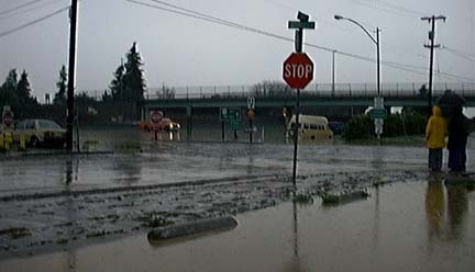 Why I Didn’t Go to Work Tuesday (2/3/98) Tuesday morning we found a line of mud on our sidewalk and debris all over the street. (Luckily my digital camera had arrived on Friday!) Monday night San Francisquito Creek, which divides Palo Alto and Menlo Park, flooded its banks and the streets in our neighborhood. Some parts of the creek bank collapsed, and tree parts collect in piles. Our flower beds looked more like ponds than earth. Luckily our house was not flooded, but we could not drive very far away from home. Many of our neighbors had to make sandbags to protect their houses. 101 South was closed; cars were drifting in the middle of the freeway. University Avenue was completely deserted except for items deposited by the flood. And Hoover School was closed for the first time since the Loma Prieta Earthquake of 1989! |