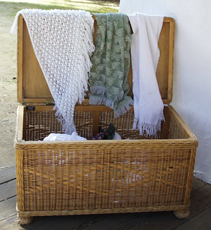 Rancho women and girls wore shawls every day. The shawls were used for warmth, to cover the head when wet or dusty, and to carry babies or other things. Some shawls would be plain and sturdy for everyday use, others would be fancy for wearing to church or to fiestas (parties). |