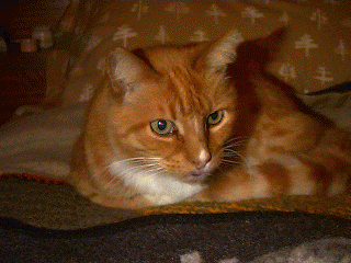 I do have an email address and will answer your message when I wake up from my nap. (Sleeping in the sun in the computer room is my favorite indoor activity.) You can also visit the web page of my person, who is starting to have white stripes in her fur, just like me. | ![]() |