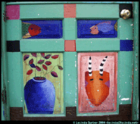 Spring 2002 Our two-dimensional tree surprised us with brillant purple blossoms, Stan convinced me to climb up to the roof for the first (and probably last!) time, Santa Fe entered Stage 3 drought regulations, Stan fought the Doomsday machine (water softener) and won, we met the skunk that turns over the rocks in the garden, and I finally painted designs on two of the doors. |