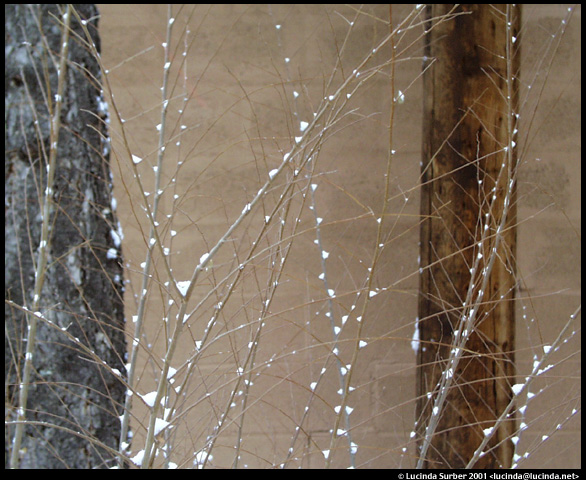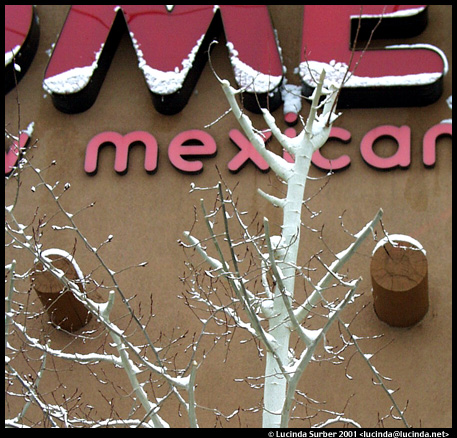 El Comedor TreeWhite snow on white birch trunk in front of El Comedor, serving New Mexican food. |
