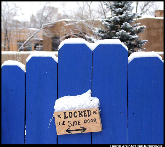 Locked GateMore fresh snow balanced on this sign on a brilliant blue gate. |