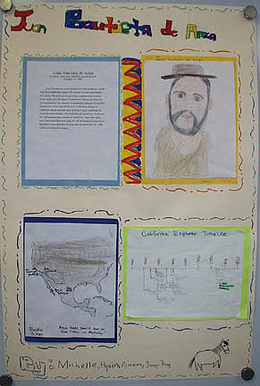 Each group chose an explorer who was important in the history of California. Students made timelines of California and placed their explorers in time, made maps to show where the explorers traveled, drew portraits of what the explorers might have looked like, and wrote essays about the goals and accomplishments of the explorers. Then each group created a poster and made a presentation to the rest of the class. Explorers we learned about: