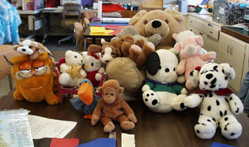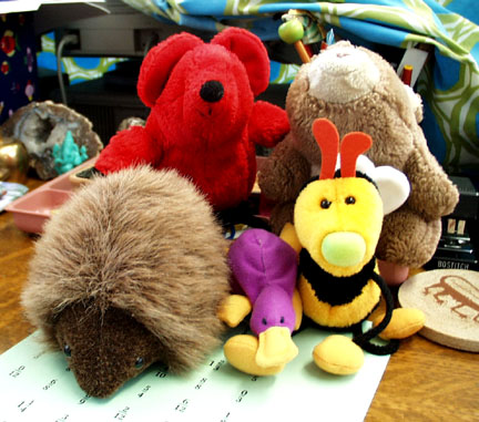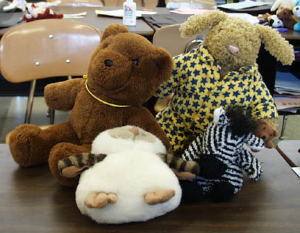 It's Stuffed Animal Day in Room 9 at Barron Park School. It looks like the 17 bears were really popular. The 12 dogs came in second. It's amazing what exotic animals people brought: hedgehogs, kangaroos, and even people! It was interesting to watch the kids make animal graphs. We asked Kiyoshi how he liked Stuffed Animal Day and he said, "It was great!" --by Devin