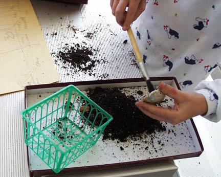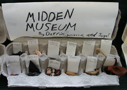 In the first section of this unit we walked to Bol Park to collect natural materials which we sorted and classified and then used for a math lesson on Venn Diagrams. Then we made masks. In the second section we listened to myths, wrote our own myths, created posters to illustrate the myths, and shared our myths around a "campfire" in the Library. In the final section of the unit we excavated "middens" by carefully sieving the soil and cleaning the artifacts, recording the spot where each artifact was discovered. The completed midden maps (another map) and museums (another museum) will help us draw inferences about the culture from the artifacts we found.