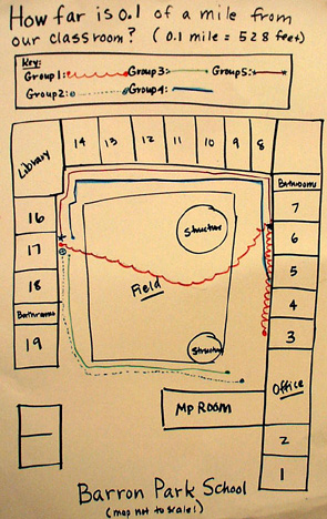 Money, Miles, and Large Numbers: We worked with decimal numbers in this unit. The final project for this unit was to figure out how to measure a tenth of a mile from our classroom door.