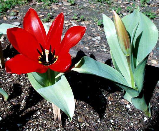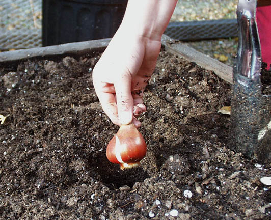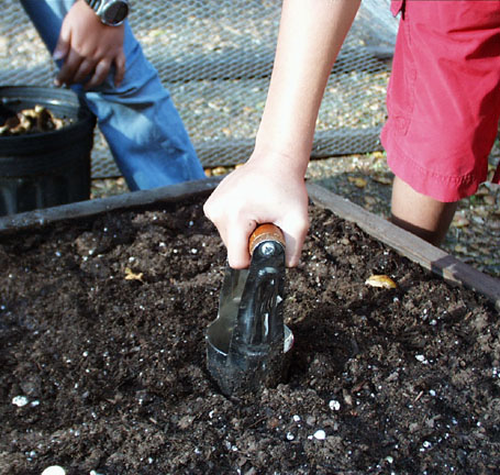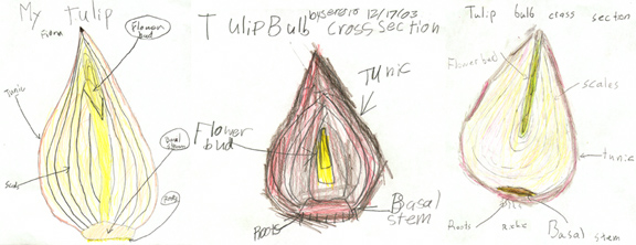 Each student measured the circumference of a tulip bulb, weighed it, and then predicted when that bulb would emerge and bloom in relation to the rest of the class bulbs. The range of the circumference of our bulbs was from 110 to 140 mm; most of our bulbs were between 120 and 135 mm. The range of the weight of our bulbs was from 20 to 41 grams; most of our bulbs weighed 30 grams or less. We made sketches of our bulbs and learned about the parts of the bulb. We dug six inch holes and planted our bulbs on November 26th. The weather was sunny and the temperature was 63° F. (Here is our data form at the Journey North website.) Since the squirrels think our tulips bulbs make tasty snacks, we protect our planter box with a squirrel guard. We cut the extra bulbs in half and sketched the internal structure of the tulip bulbs. We discovered that the tulip bulbs are made of many layers surrounding the bloom bud. On January 5th, we observed that one of our tulips had emerged; here is our data report. By February 5th, almost all of our tulips had emerged. You can track the progress of spring (measured by the blooming tulips) by looking at the weekly maps. Our first tulips bloomed on March 8th; here is our data report. By the end of the week our entire tulip bed was in bloom.
