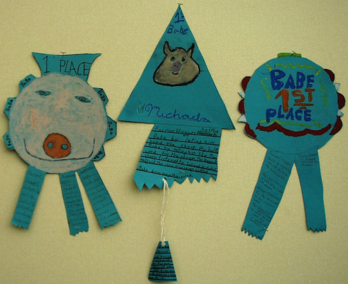 Babe, the Gallant Pig, by Dick King-Smith, was fun to read even though the dialect was often difficult to understand. We learned many new vocabulary words about sheep herding and discovered how being brave and polite can lead to success. The final activity for this book was to create ribbons (three examples & three more & a final two examples) summarizing how each character helped Babe achieve his goal.