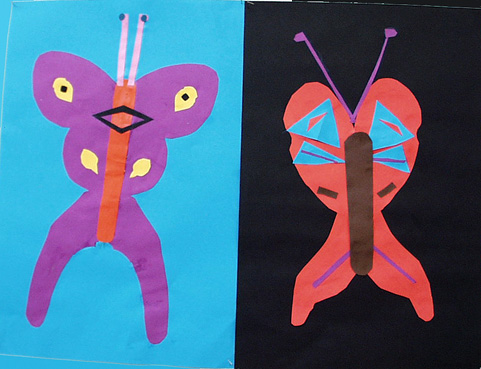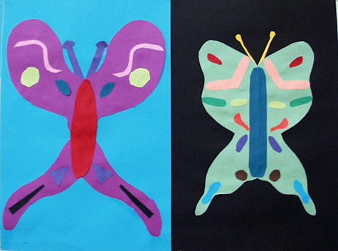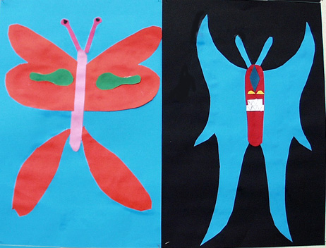 Symmetrical Butterflies: After studying mirror symmetry we made butterflies with cut paper. Here are two examples, another two, and two more