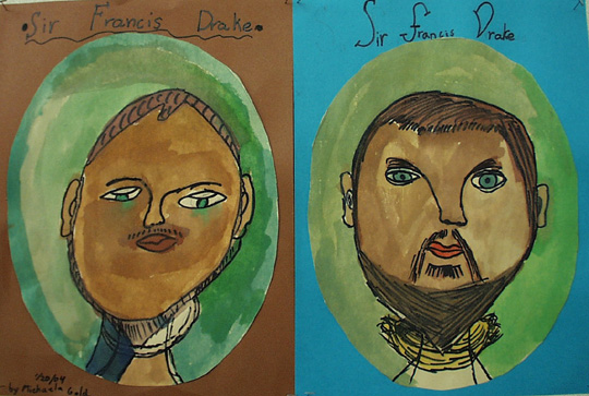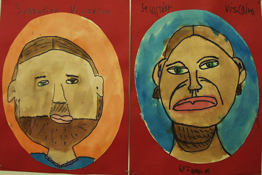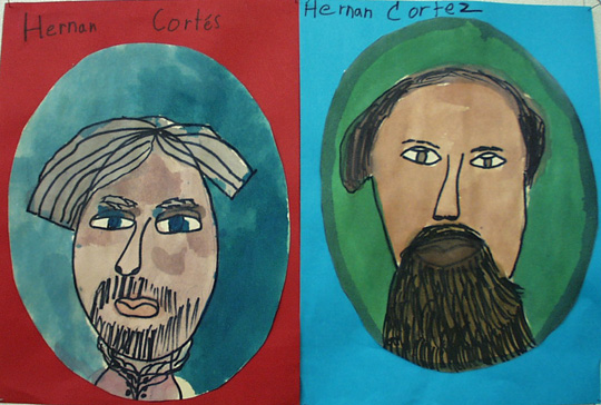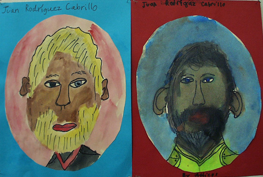 Explorer Portraits: We learned to make portraits while studying explorers. Here are portraits of Álvar Nuñez Cabeza de Vaca, Juan Rodríguez Cabrillo, Hernán Cortés, Sir Frances Drake, and Sebastián Vizcaíno.