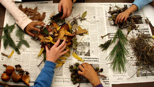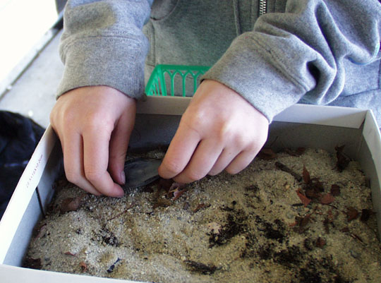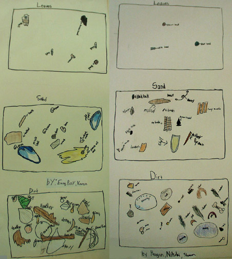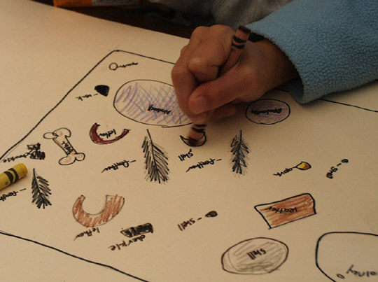 Investigating Artifacts: In the first section of this unit we walked to Bol Park to collect natural materials which we sorted and classified. We used our natural materials for a math lesson on Venn Diagrams. It was fun trying to figure out the Secret Sorting Rule of each Venn Diagram: Venn Diagram #1, Venn Diagram #2, Venn Diagram #3. Most were very hard to guess! Then we made masks (more masks). In the second section we listened to myths, wrote our own myths, created posters (more posters) to illustrate the myths, and shared our myths around a “campfire” in our classroom. In the final section of the unit we excavated “middens” by carefully sieving the soil, cleaning and polishing the artifacts, and recording the spot where each artifact was discovered with a sketch. The completed midden maps and museums helped us draw inferences about the culture from the artifacts we found.