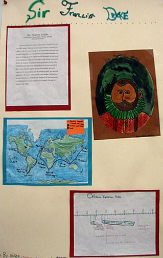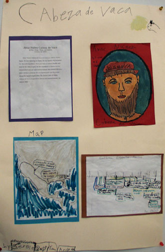 California Explorers: Each group chose an explorer who was important in the history of California. Students made timelines of California and placed their explorers in time, made maps to show where the explorers traveled, drew portraits of what the explorers might have looked like, and wrote essays about the goals and accomplishments of the explorers. Then each group created a poster and made a presentation to the rest of the class. Explorers we learned about: Álvar Nuñez Cabeza de Vaca, Juan Rodríguez Cabrillo, Hernán Cortés, Sir Francis Drake, Sebastián Vizcaíno.