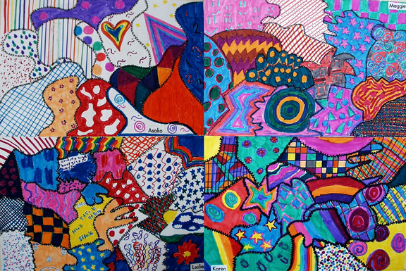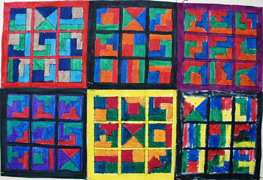 Quilts: Each student made a Crazy Quilt with a different design in each quilt piece. The finished individual quilts are displayed together in a class quilt which symbolizes all of the different personalities that are joined together into one whole classroom community. Here are four example quilts, and four more.