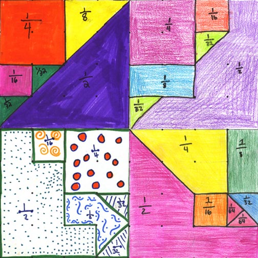 Equal Shares, Different Pieces: We explored fractions in this unit. While looking at fractions as equal area divisions, we made Quilts of Fourths (more examples). We also used the area model to divide Squares and Rectangles into fractional parts.