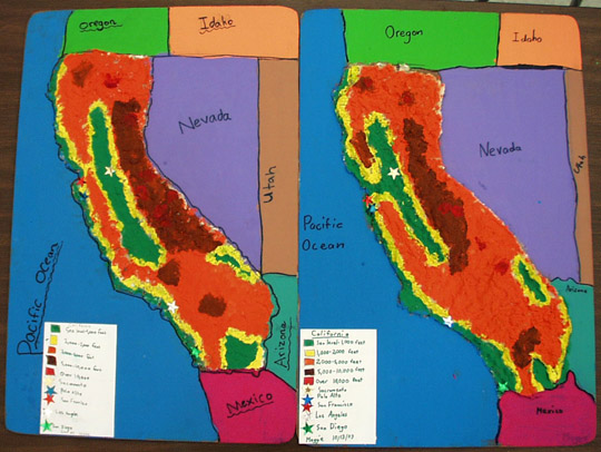 California Relief Maps: Geography was our first unit in Social Studies. We sketched the major geographical features on large boards and modeled the mountains and valleys. After the “goop” dries, we painted the elevations and the surrounding states. Finally we located five important cities and made a key. We agreed that this was a fun and messy project! The finished maps were quite impressive. Here are two examples and two more.