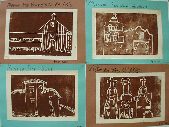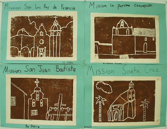Mission Prints: We sketched our missions, used carbon paper to reverse our sketches, traced the carbon paper onto foam board, and then printed. This was a long and messy project, but the prints are amazing! Here are four examples and four more.