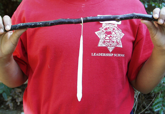 It takes many many dippings to make the candle thick enough to use. The Peralta family would have made candles out of tallow (cow fat), which tends to smoke and smell when burned. Candles out of wax like this would have been saved for very special occasions. |